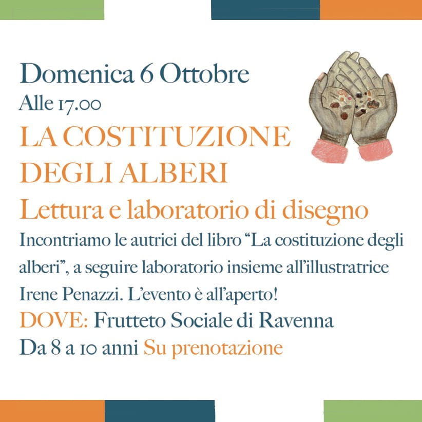Domenica 6 ottobre alle ore 17:00 Incontreremo le autrici del libro “La costituzione degli alberi”, a seguire laboratorio insieme all’illustratrice Irene Penazzi. L’evento è aperto! Dove: Frutteto Sociale di Ravenna (https://maps.app.goo.gl/ktRUpGMWrKSP9isc7) Richiesta la prenotazione al numero: 0544202813
