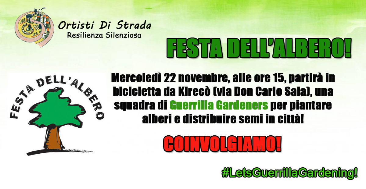 Mercoledì 22 novembre, vi aspettiamo a Kirecò (via Don carlo Sala, Ravenna) alle 15, per partire in bicicletta assieme e piantare alberi in alcuni punti della città. Prepareremo anche delle bustine di semi per i partecipanti e per chi incroceremo per strada! Per dare valore a… Continua a leggere “Festa dell’Albero!”