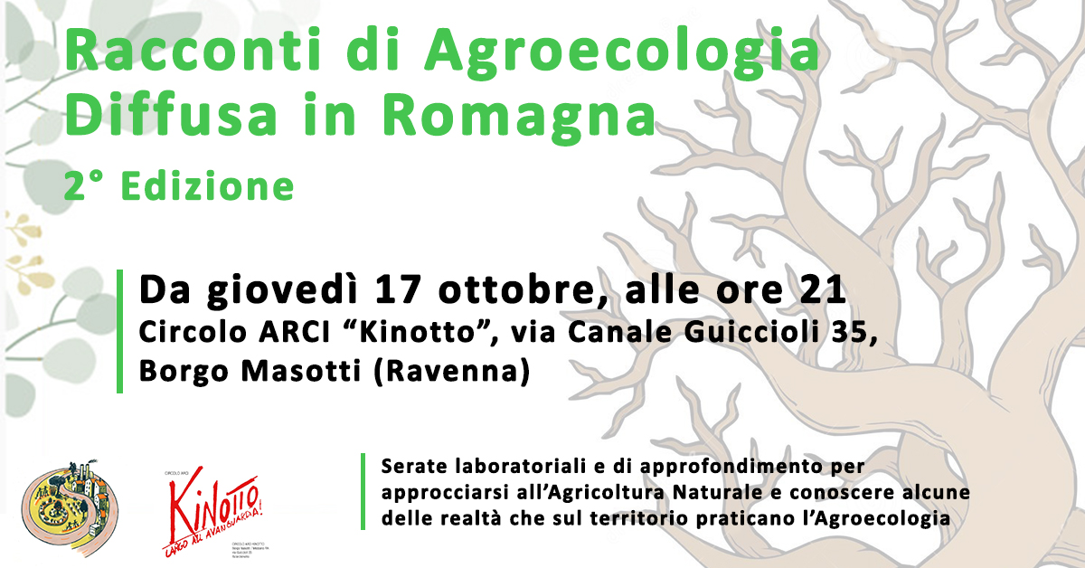 Ciao a tutte e a tutti! Vi aspettiamo giovedì 17 ottobre alle ore 21 al Circolo Arci “Kinotto” in via Canale Guiccioli n.35 Borgo Masotti (RA) per il primo appuntamento sul ciclo di incontri di “Agroecologia Diffusa in Romagna” per discutere e divulgare pratiche… Continua a leggere “Racconti di Agroecologia Diffusa – 2° Edizione”