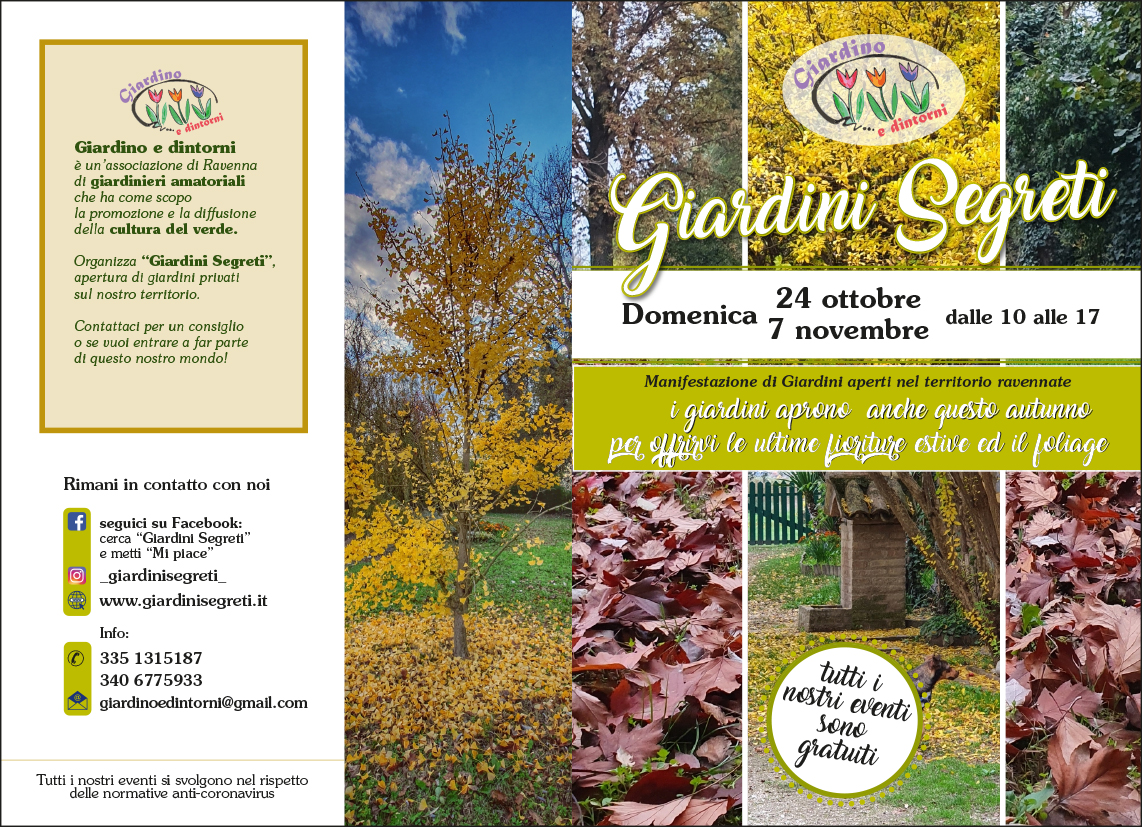 Dopo la pausa forzata dello scorso anno a causa del Covid, torna con grande entusiasmo e slancio la manifestazione “Giardini segreti” organizzata e promossa dall’associazione Giardino & Dintorni di Ravenna. Saranno 2 le domeniche (24 ottobre e 7 novembre) in cui i soci dell’associazione apriranno i… Continua a leggere “Giardini Segreti d’Autunno – 24 ottobre e 7 novembre”