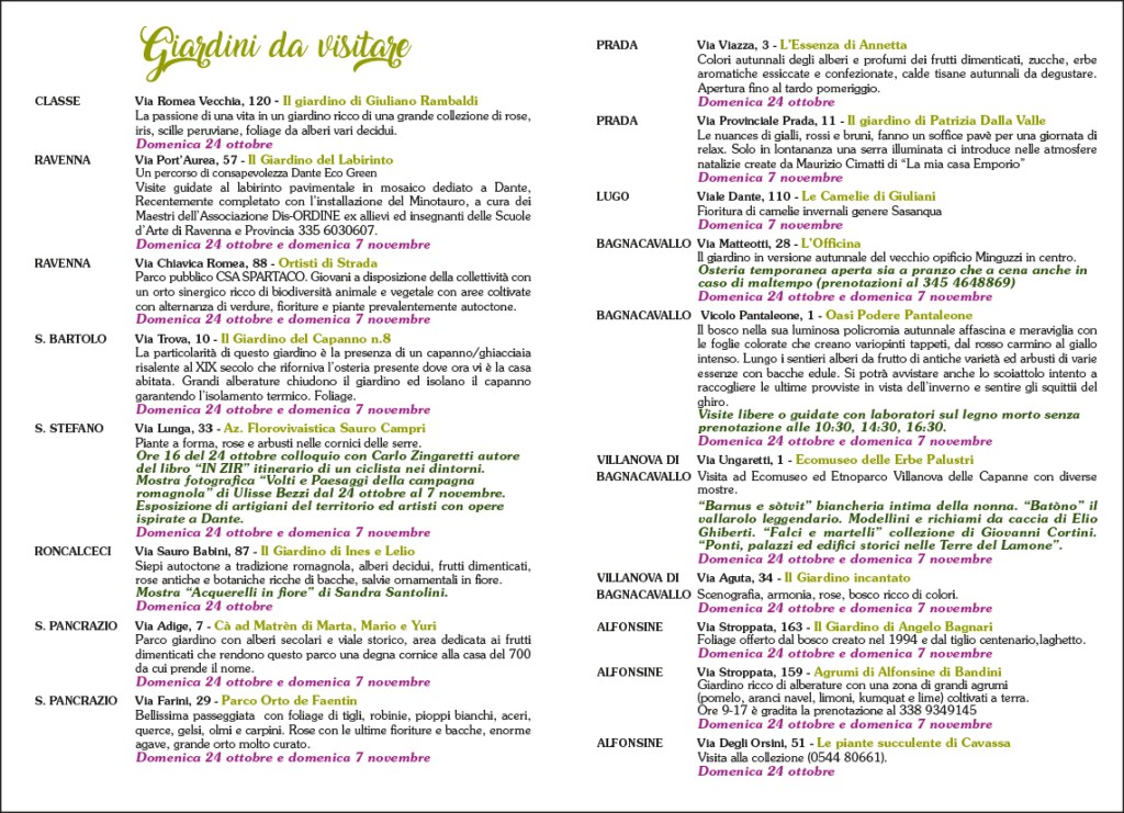 Tantissimi i giardini privati e pubblici aperti che possono essere ammirati e visitati in tutta la provincia di Ravenna con ingresso gratuito. Un’occasione per scoprire e riscoprire dei veri e propri gioielli che sono presenti sul nostro territorio.