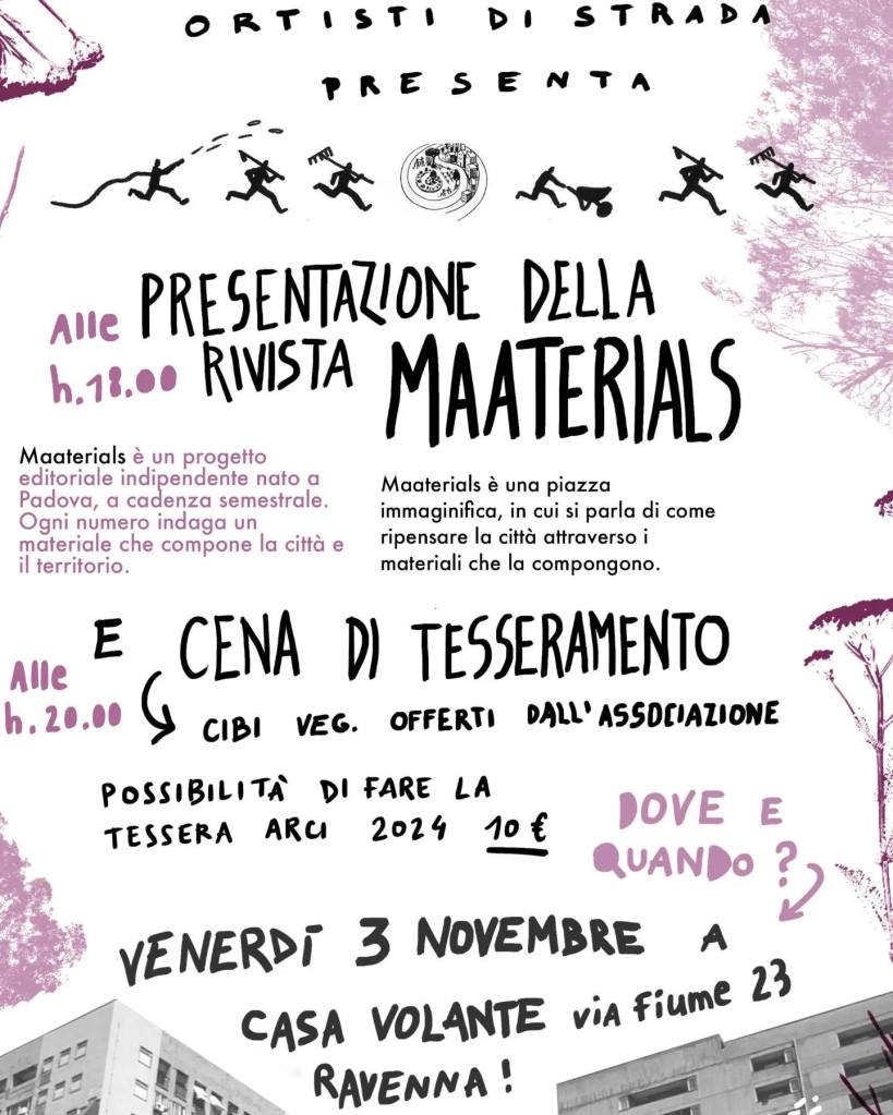 Evento da non perdere: venerdì 3 Novembre alle 18.00 a Ravenna presso Casa Volante in via Fiume 23, presentazione della rivista MAATERIALS: come ripensare la città a partire dai materiali con cui è fatta. Si parlerà di architettura, paesaggio, società e ambiente.